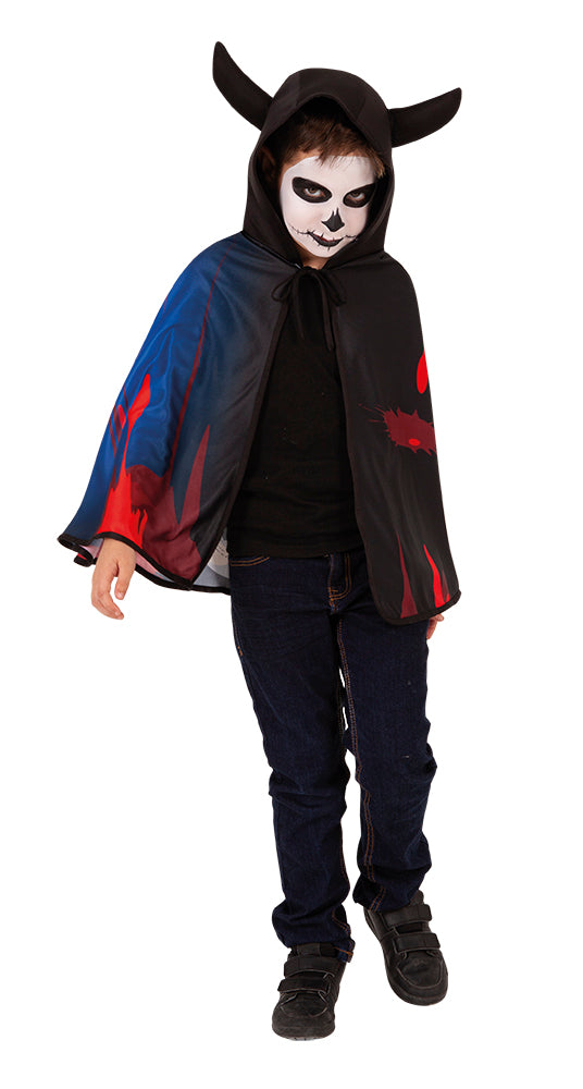 Printed skull cape with children's hood. Invite your friends to create a group of skeleton costumes and you can be the leader of the group. Have fun playing pranks on Halloween night. Ideal for Halloween and costume parties.