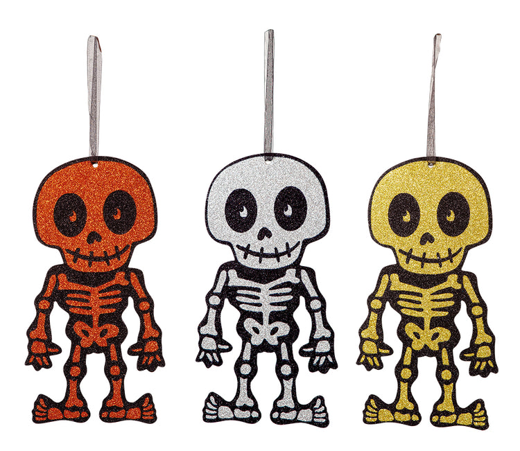 Skeleton pendant with glitter in 3 assorted colors. Ideal for decorating your walls and adding color to Halloween night.