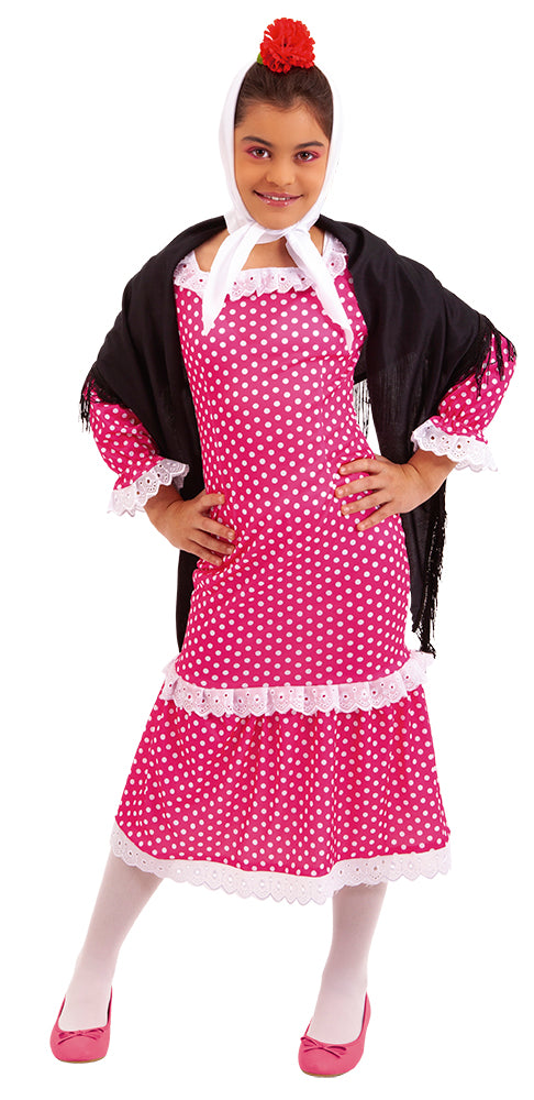 Deluxe chulapa costume for children, including dress, shawl, scarf, and carnation. Celebrate San Isidro with this traditional chulapa costume. Also ideal for carnivals and costume parties.