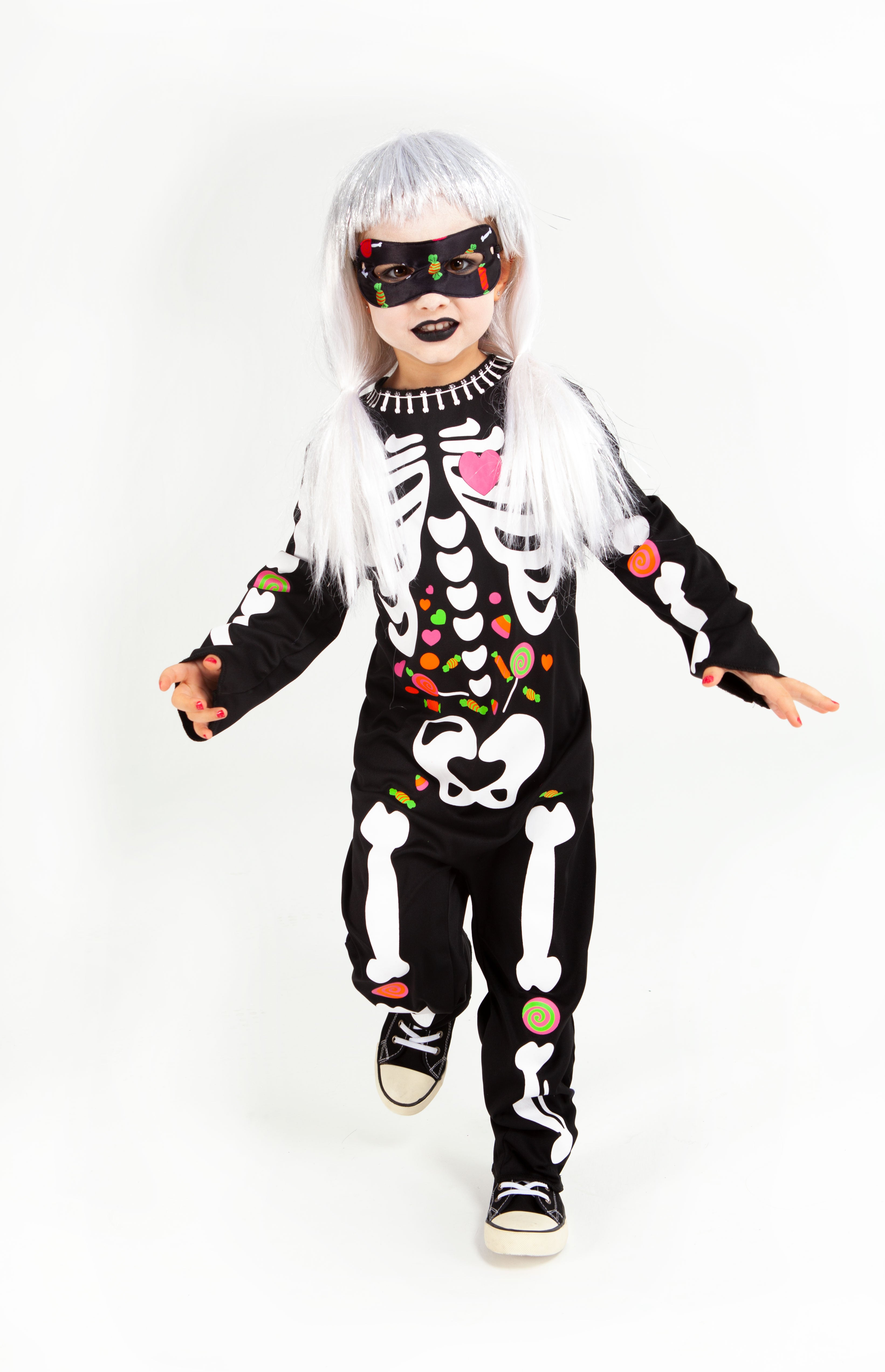Children's masked candy skeleton costume, a cute skeleton covered in candy prints all over its bony body, also includes a mask so no one will recognize you when you take all the candy from the candy holders.