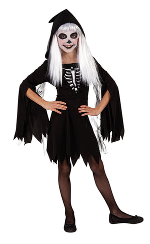 Children's hooded skeleton costume consisting of a printed hooded dress and belt. Invite your friends to form a group of living skeletons and you'll have the coolest hooded skeleton costume as the team leader. You'll collect all the candy in the neighborhood with this authentic costume. Ideal for birthdays, Halloween, and costume parties.