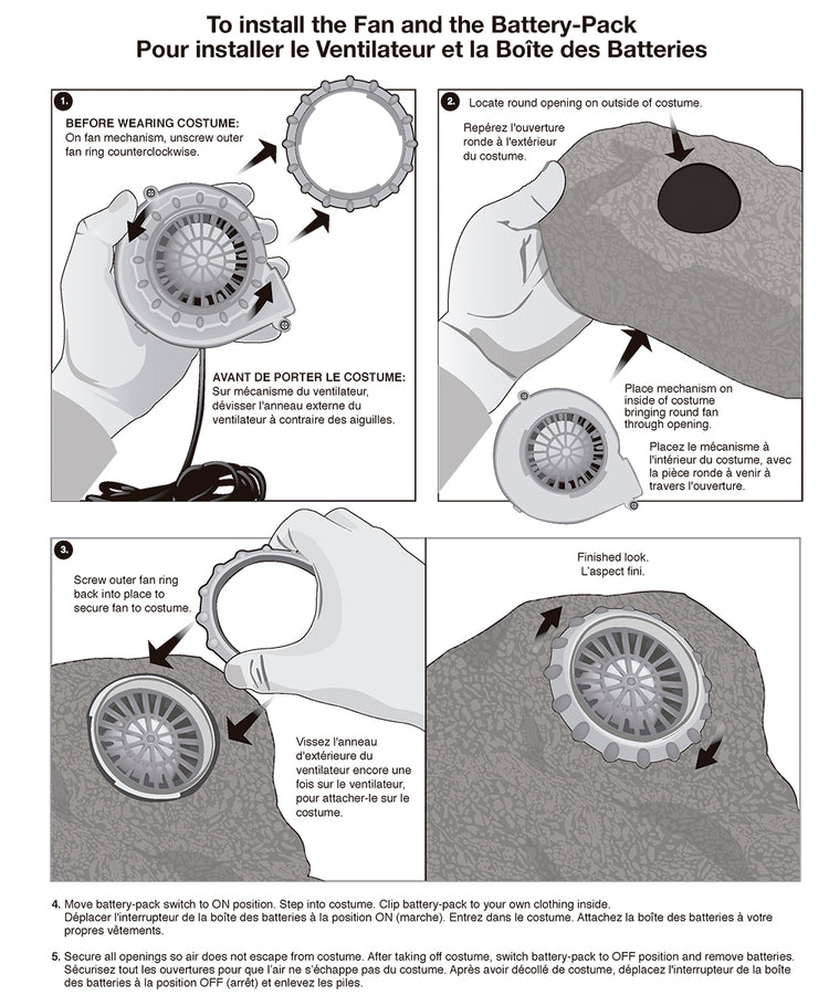 Inflatable Jumpsuit, Battery Pack Requires 4 AA Batteries (Not Included). Instructions for Costume and Battery Pack Included.