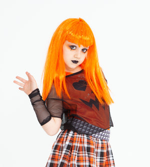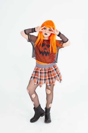 Rebel Pumpkin costume for the most daring Halloween partygoers, a very complete costume consisting of a printed dress, top, mittens, tights, and belt.