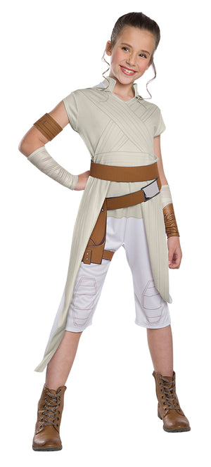 Original children's Rey costume from Star Wars Episode 9, consisting of a jumpsuit with attached bandages, belt with holster, arm sleeves, and arm bands. Get together with your friends to rebel against the Empire and defeat the dark side. This product is officially licensed by Star Wars.
