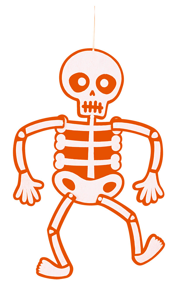 Hanging skeleton made of felt, orange with white bones. Its limbs are designed so you can move and position them however you like to decorate any space for Halloween.