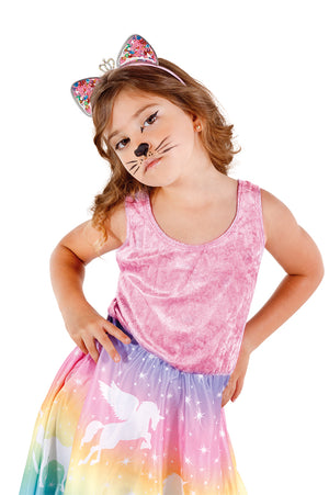Diadema de gatita coronita con corazones y cochas de colores brillantes dentro de sus orejas. Complementa tu disfraz de gatita con esta diadema y prepárate para las fiestas de carnaval y halloween.