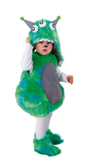 Disfraz Alien bebé, un alien muy amigo de los terrícolas que viene para quedarse con nosotros.Disfraz compuesto por Túnica, gorro con 3 ojos y antenas, calentadores