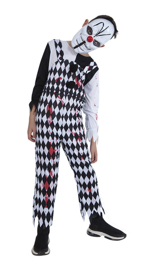 El disfraz infantil de arlequín sangriento es perfecto para tus sustos en Halloween, con sus característicos rombos y la máscara con manchas de sangre, hacen de este comediante burlón y siniestro, un disfraz idóneo para la noche de Halloween. Contiene jumpsuit con sangre y máscara.
