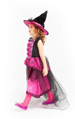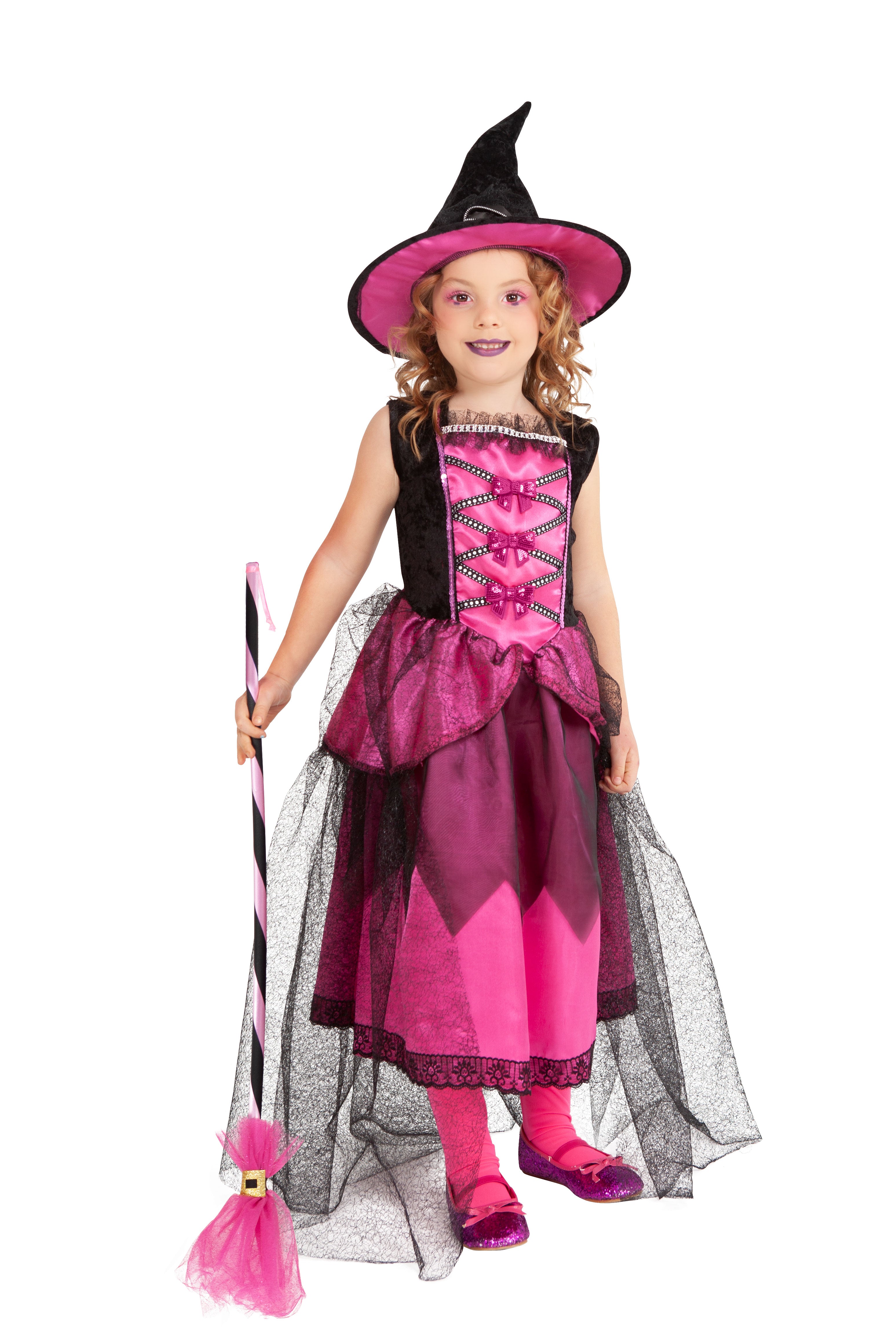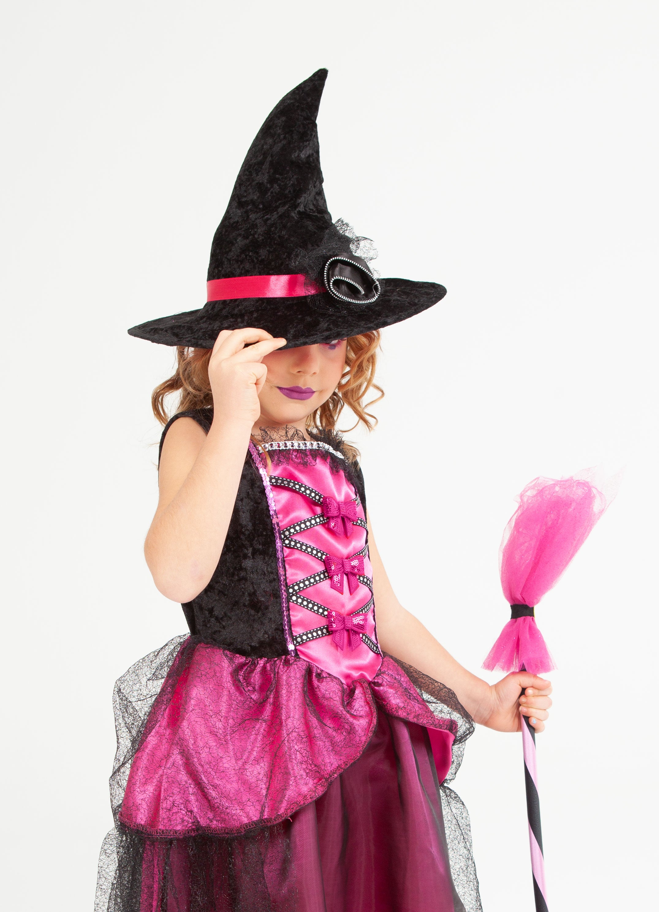 Disfraz bruja chic infantil, un disfraz muy distinguido para ir a la moda y no pasar desapercibida en tu fiesta de Halloween. El disfraz consta de vestido con bonitos acabados y triple lazo en el pecho, sombrero con flor efecto cremallera.