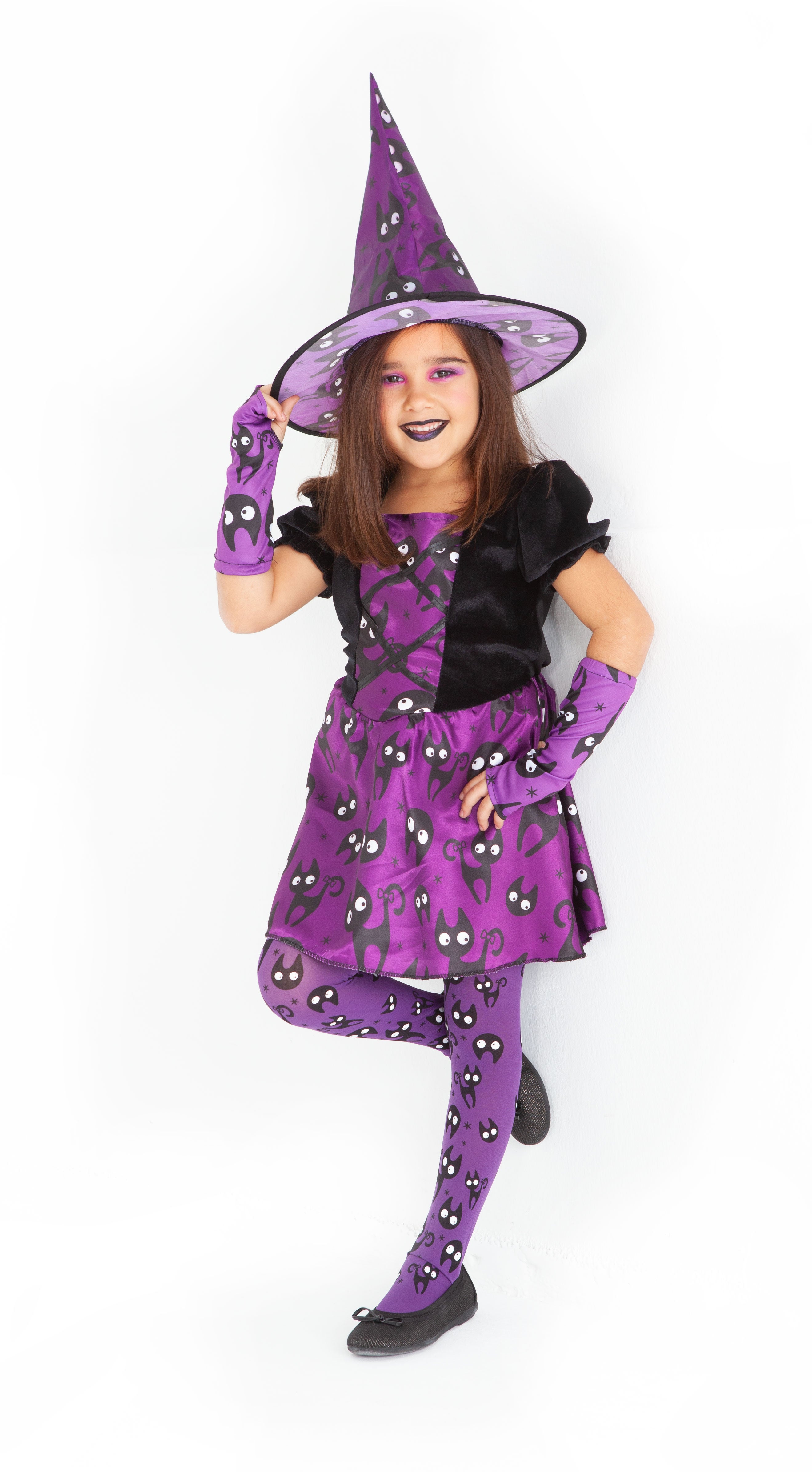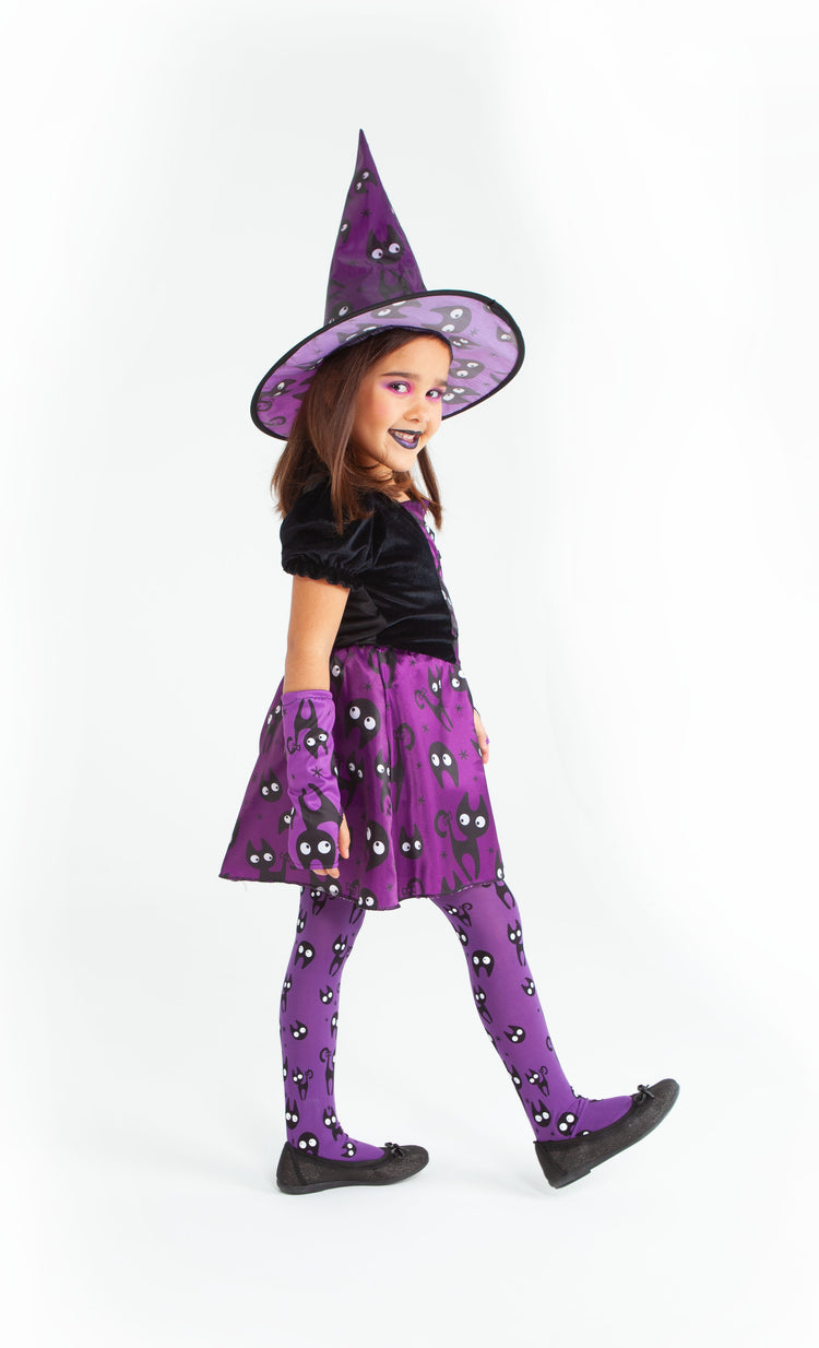 Disfraz bruja Mininos infantil, un disfraz lleno de ternura con todos esos gatitos estampados que harán las delicias de las más jovencitas. El disfraz es muy completo y consta de vestido, sombrero, mitones, y medias. Prepárate para maullar durante todo el día y algo de la noche.