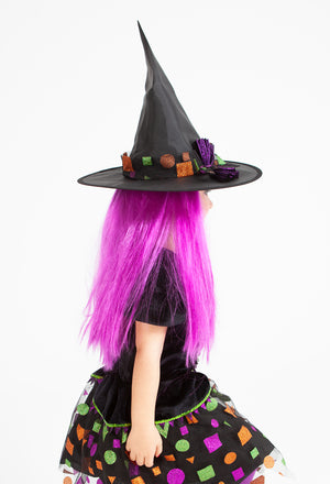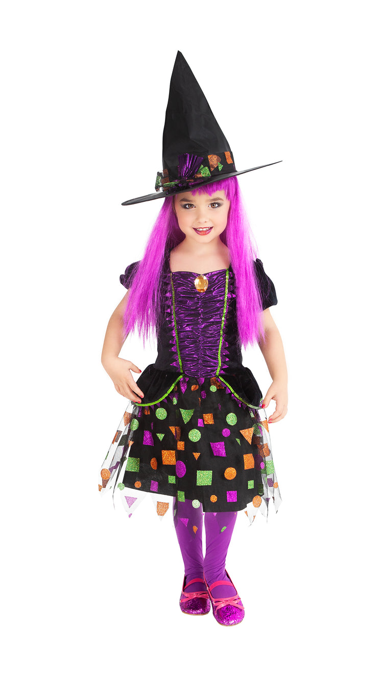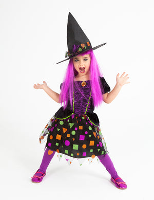El disfraz bruja Top Symbol infantil llega directamente de desfilar en la famosa pasarela del terror de Milán, donde ha sido aclamada por toda la crítica especializada en la moda del terror. El disfraz consta de vestido con piedra de bisutería en el pecho y sombrero. Serás la sensación de la noche halloweenera.