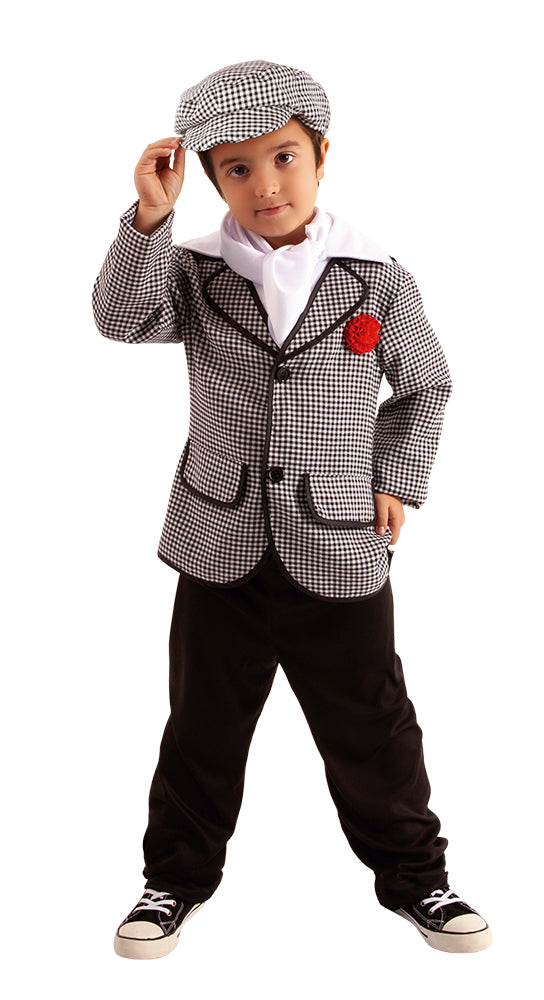 Disfraz infantil de chulapo deluxe compuesto de chaqueta con clavel, pantalón, pañuelo y gorra. Celebra el San Isidro con este característico y tradicional disfraz de chulapo. También es ideal para carnavales y fiestas de disfraces.