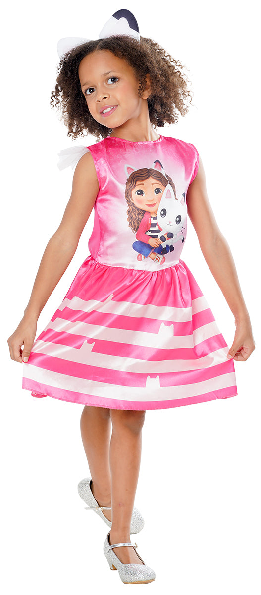 Conoce a Gabby, una niña de 12 años entusiasta de los gatos. Junto con sus amigos Pandy, Cakey, Mercat, y los demás, pueden reducir su tamaño para entrar en la mágica casa de muñecas de Gabby donde viven nuevas aventuras, canciones y problemas que resolver. Conviértete en Gabby con este mini vestido sin mangas de satén con rayas blancas y rosas, y detalle impreso en el torso. El vestido presenta una falda de satén rosa con rayas blancas y siluetas de gatos impresos. Para completar el disfraz incluye una diadema con orejas de gato