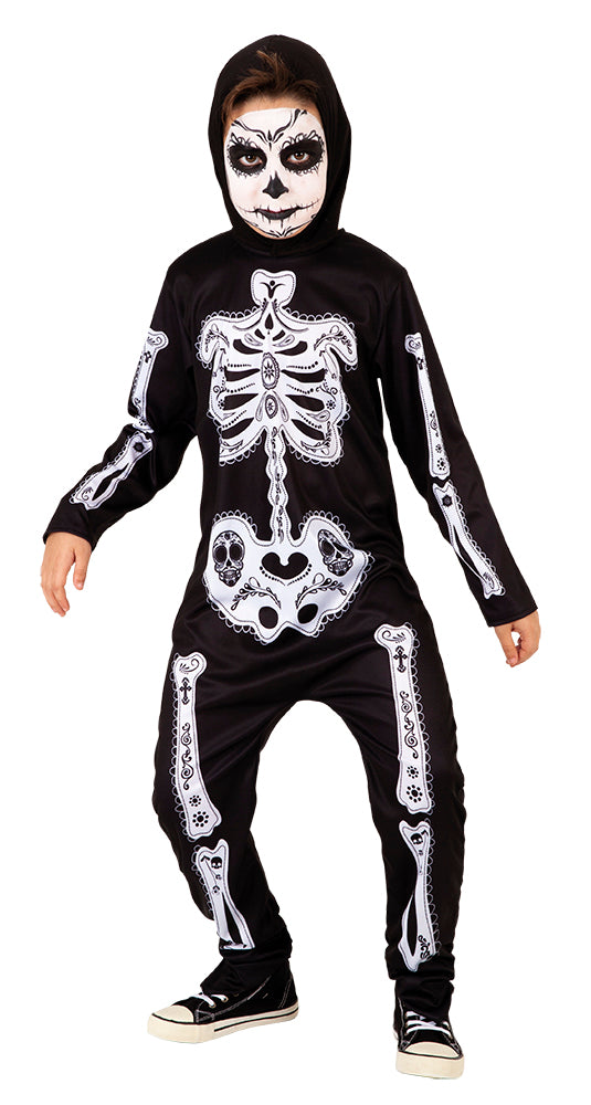 Disfraz de Huesud@ día de los muertos infantil compuesto de Jumpsuit y gorro. Invita a tus amigos a crear un grupo disfraces de huesos y tu llevas el mando del grupo. Juega a hacer divetidas travesuras en la noche de halloween. Ideal para halloween y fiestas de disfraces.