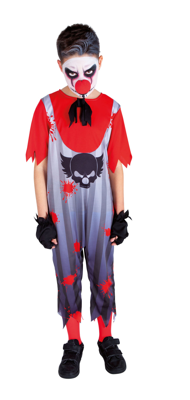 Disfraz de payaso villano infantil, ideal para la silenciosa noche de Halloween, porque además produce un sonido desgarrador para hacer las delicias de los más atrevidos. Este disfraz incluye jumpsuit con caja de sonido, guantes, nariz, calcetines.