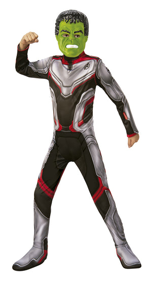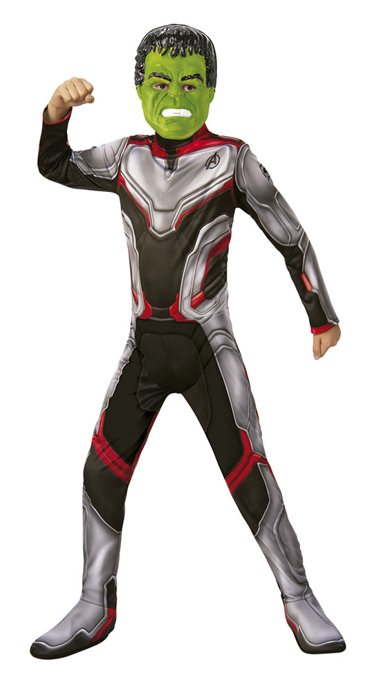 Disfraz infantil Team Suit en caja compuesto de Jumpsuit y 3 máscaras: Capitán América, Iron Man y Hulk. Este traje fue diseñado para que los Avengers pudieran viajar en el tiempo, salvar a sus amigos superhéroes y cambiar la historia de nuevo. Dale magia a tu mundo y conviértete en uno más del equipo Avengers con este traje team suit. ¡Ideal para cumpleaños, carnavales y fiestas de disfraces! Este producto es oficial de licencia Avengers Endgame.