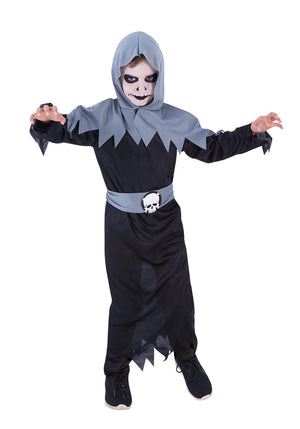 Disfraz de Verdugo para niño, pertenece a la familia de los Cheapyweens los disfraces más interesantes en relación calidad-precio. Disfraz compuesto por túnica con capucha y cinturón con calavera
