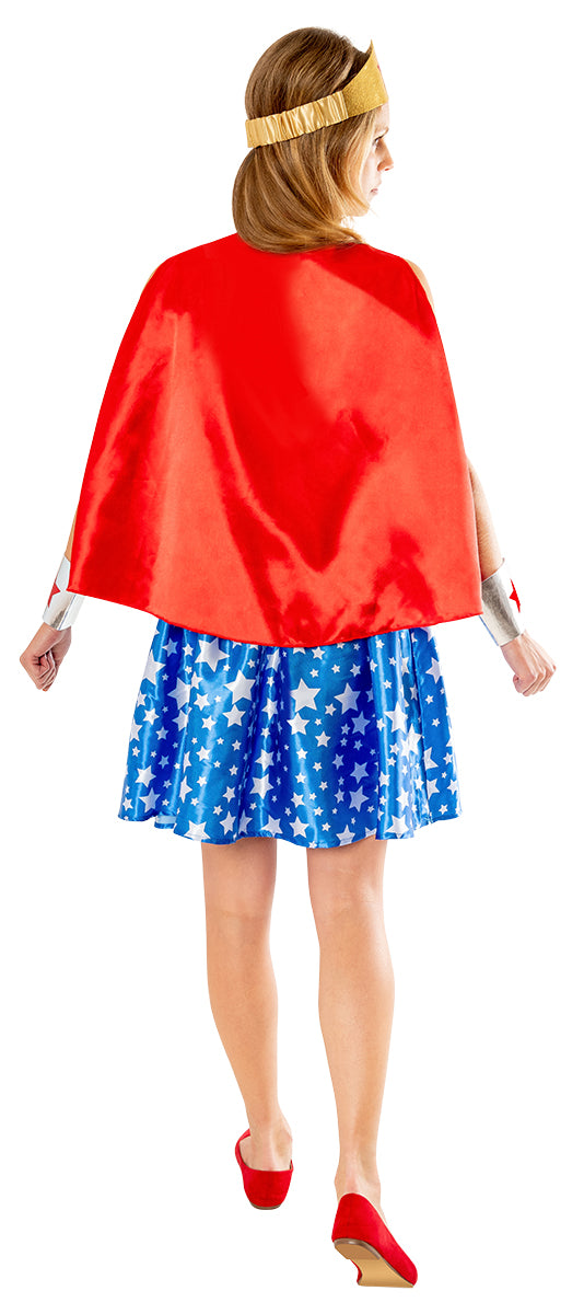 Wonder Woman es la princesa Diana de Themyscira, pero adopta la identidad civil de Diana Prince en la vida diaria. La superheroína de DC de la selva amazónica, tiene fuerza y velocidad sobrehumanas, y usa armas confiables como su lazo de la verdad, su tiara y pulseras a prueba de balas. Se une a otros héroes como Batman y Superman como parte de la Liga de la Justicia y se enfrenta al crimen dondequiera que esconden.