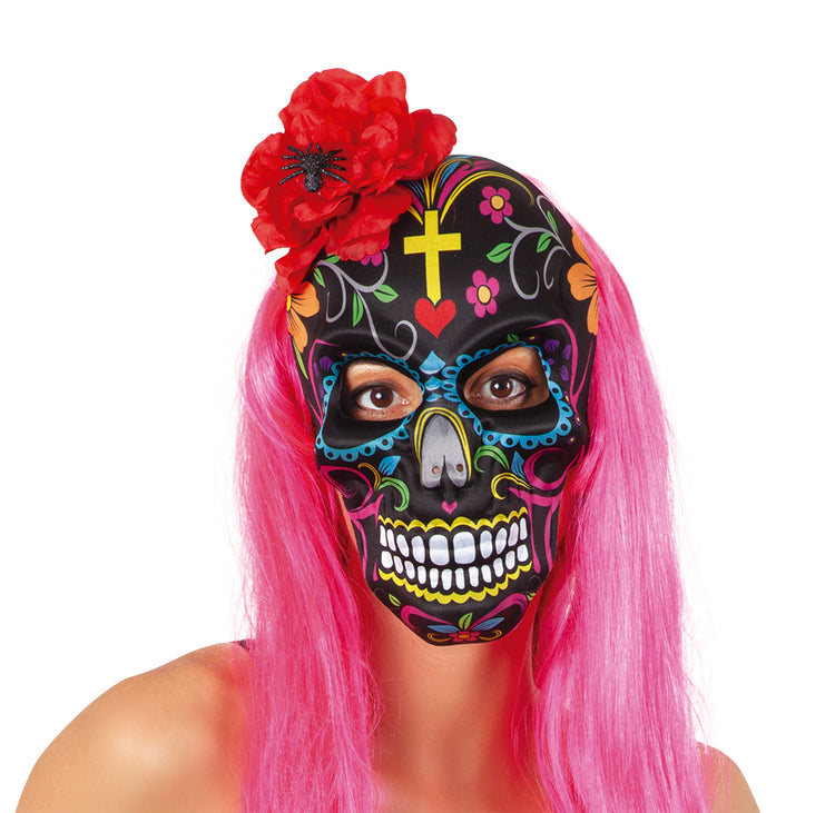 Una fantástica máscara de catrina con rosas y araña llena de color y flores. ¡Una representación viva del día de los muertos! Ideal para celebrar halloween